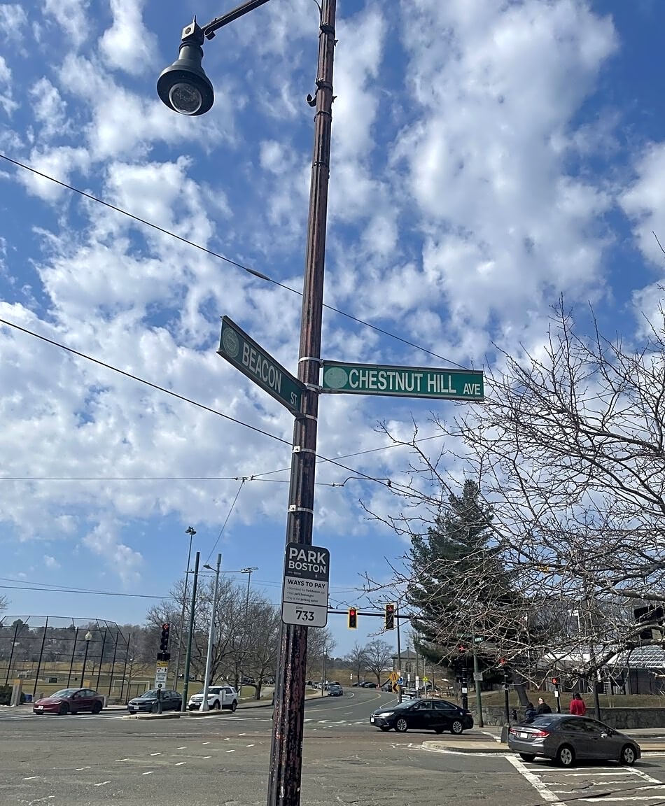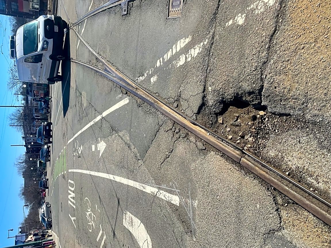 Intersection Of Beacon St And Chestnut Hill Ave, Brighton, MaDangerous pothole in center of street under tracks near Cleveland Circle. Deep and treacherous for bikers as directly in bike lane and walkers. Near intersection of Beacon Street and Chestnut Hill Avenue before enter busy intersection heading outbound.