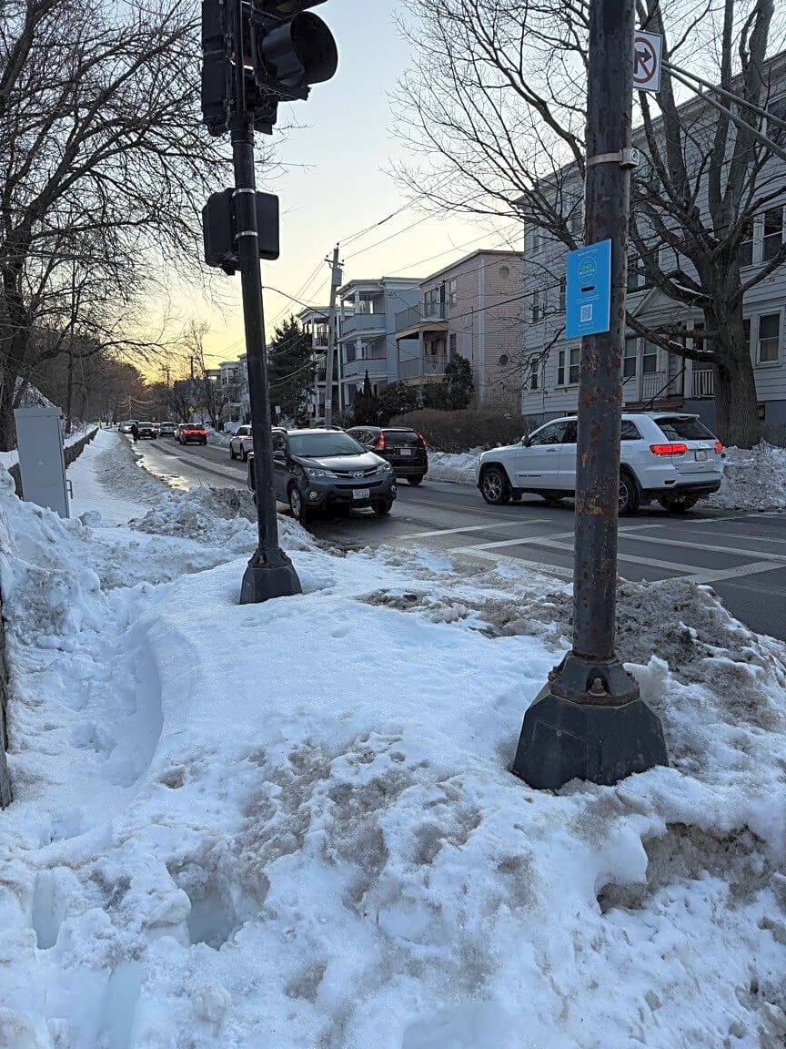Intersection Of Williams St And Forest Hills St, Jamaica Plain, MaSidewalk and access to crosswalk signal button not accessible due to large piles of snow not being removed at the entrance to Franklin Park