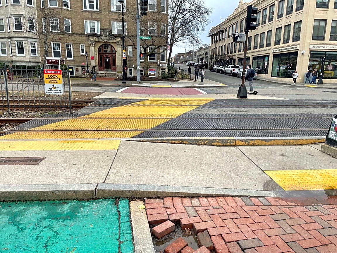 Intersection Of Saint Mary's St And Commonwealth Ave, Boston, MaLoose and missing bricks in the crosswalk crossing Eastbound Comm. Ave. at 735 Comm. Ave.
