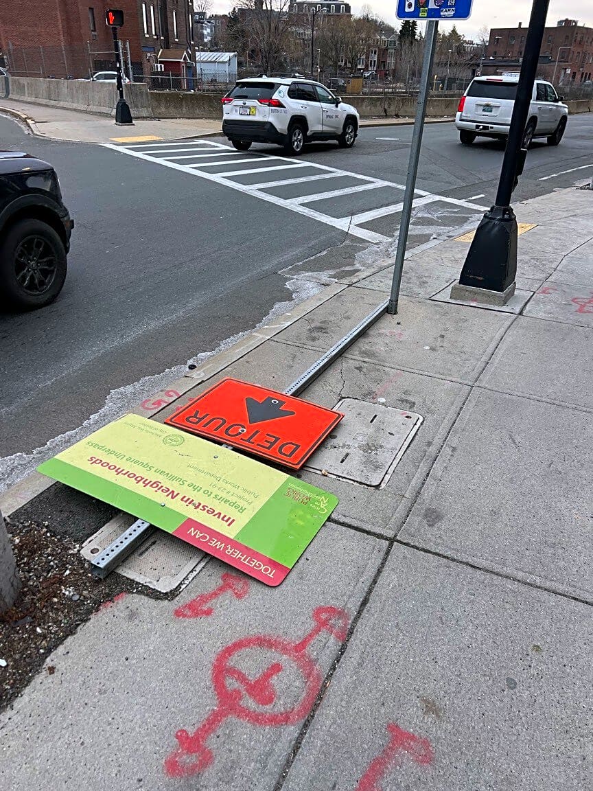24 Cambridge St, Charlestown, Ma, 02129This sign talking about repairing Sullivan Square has been just sitting on the sidewalk for months. I don’t think it was ever actually mounted it just showed up one morning like shown in the photo. Is it just being stored here or is it supposed to be mounted? It kinda blocks the sidewalk at what is an already dangerous and problematic intersection.
