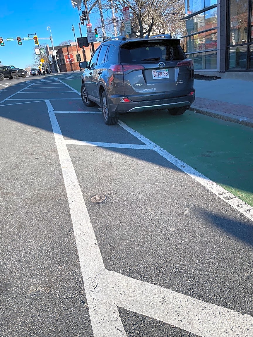 Intersection Of Centre St And Belgrade Ave And Manthorne Rd, West Roxbury, MaVehicle parked in bike lane