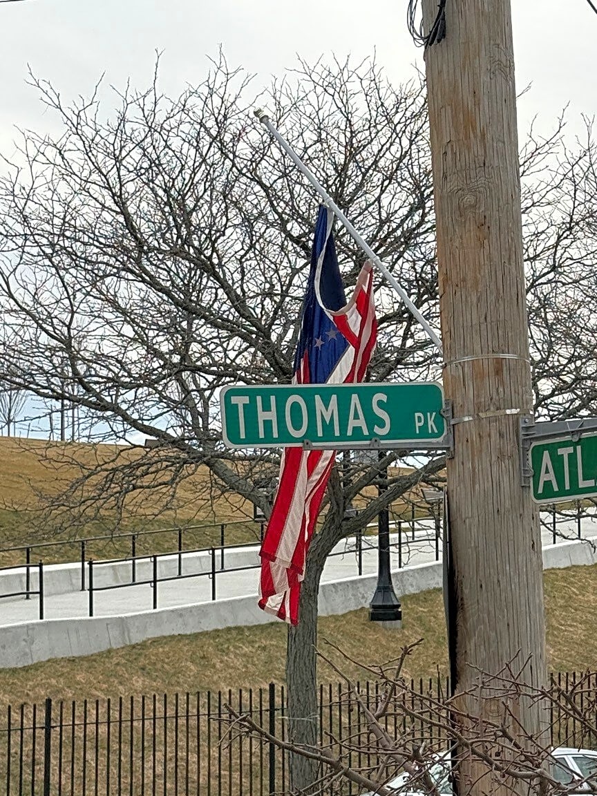 Intersection Of Atlantic St And Thomas Park, South Boston, MaCould you please repair/re-connect all the 250 celebration flags around Thomas park/dorchester heights. One is even torn to shreds after the st Patrick’s wind storm.