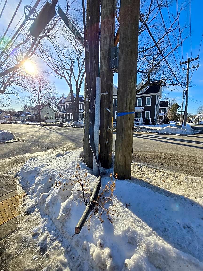 Intersection Of Colchester St And Neponset Valley Pkwy, Hyde Park, MaExposed cut cable over sidewalk. Seems potentially dangerous, yes?