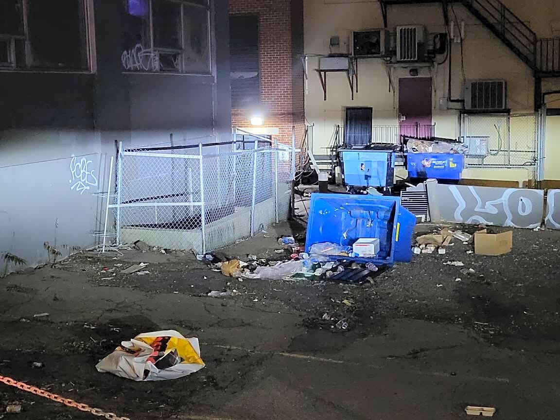 Giant mess in lot and behind building