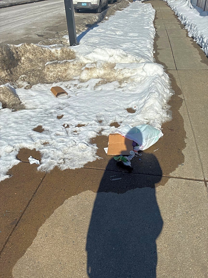 Intersection Of Vesta Rd And Blue Hill Ave, Dorchester, MaTrash on sidewalk