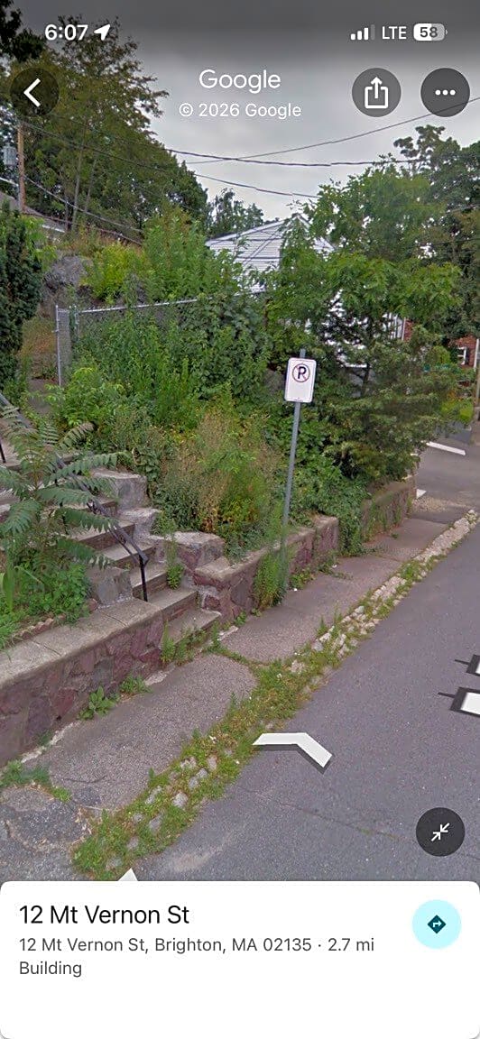 12 Mount Vernon St, Brighton, Ma, 02135Sidewalk is completely covered by snow. The sidewalk needs to be cleared for pedestrians. This is a narrow street. Google maps images included to show the sidewalk.
