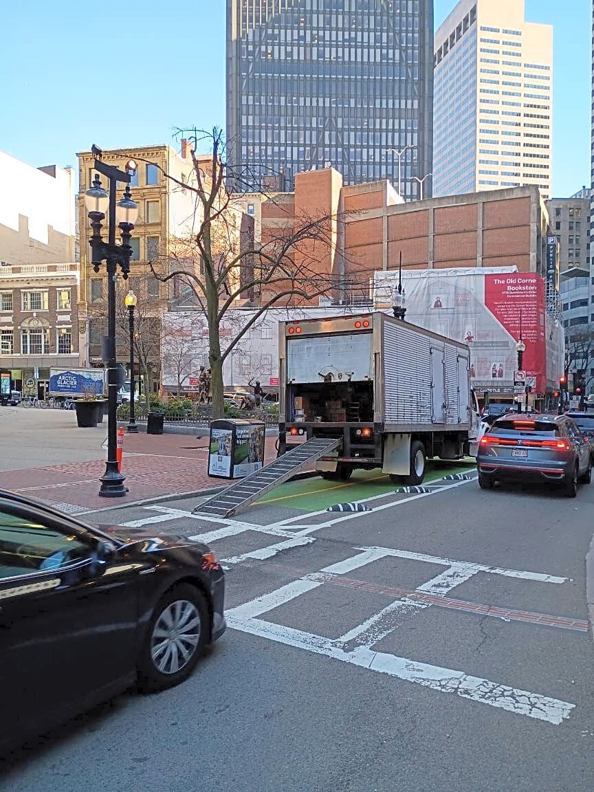 307 Washington St, Boston, Ma, 02108Truck parked in bike lane endangering residents on bikes