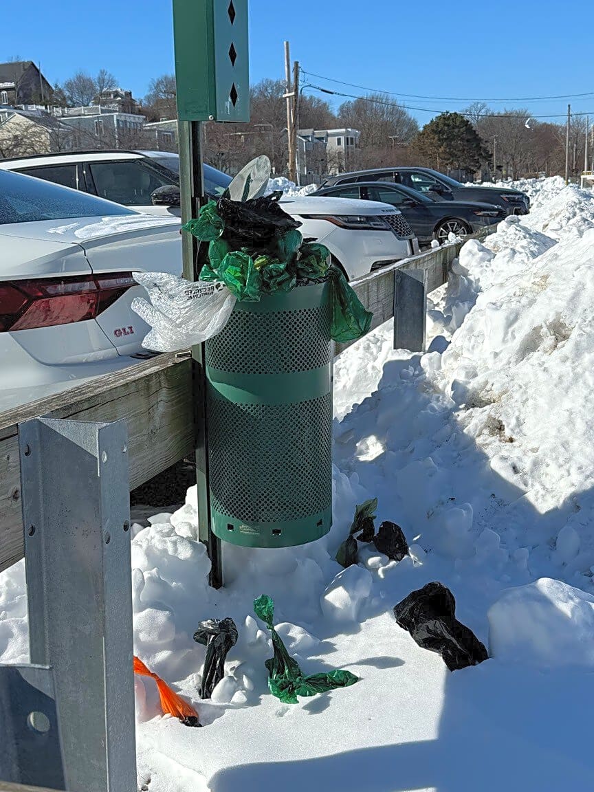 Intersection Of Pearl St And Medford St, Charlestown, MaThe poop collecting bins are overflowing behind 275 Medford St. in Charlestown (by the open lot). It’s been like this for several days now - since the snowstorm. Definitely a health hazard!