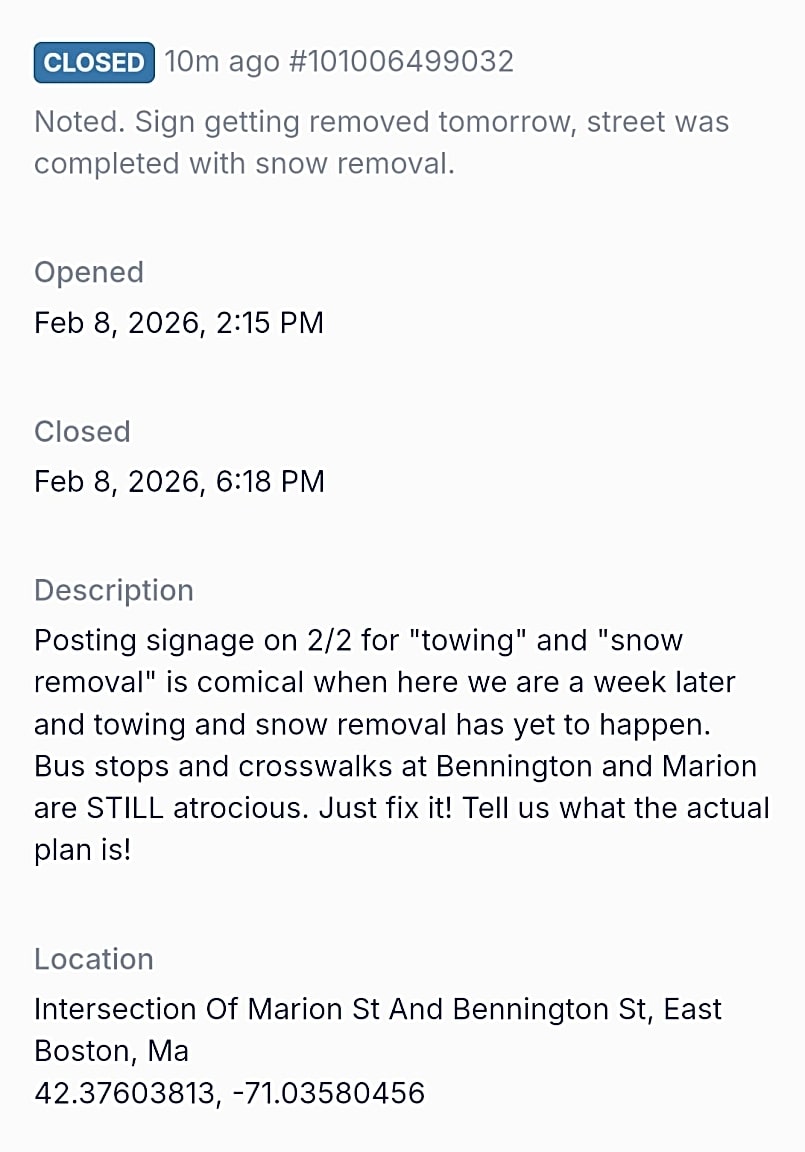 Intersection Of Marion St And Bennington St, East Boston, MaRe 101006499032 Stop gaslighting us. We actually live here, and this intersection has not been cleared. The sidewalks are lined with mounds of snow that we are tripping over. You all should not be closing requests without evidence.