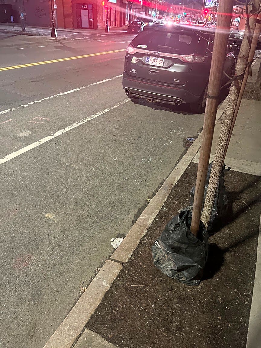 Glass in car parking lane directly across the street from Dunkin' Donuts near the small tree