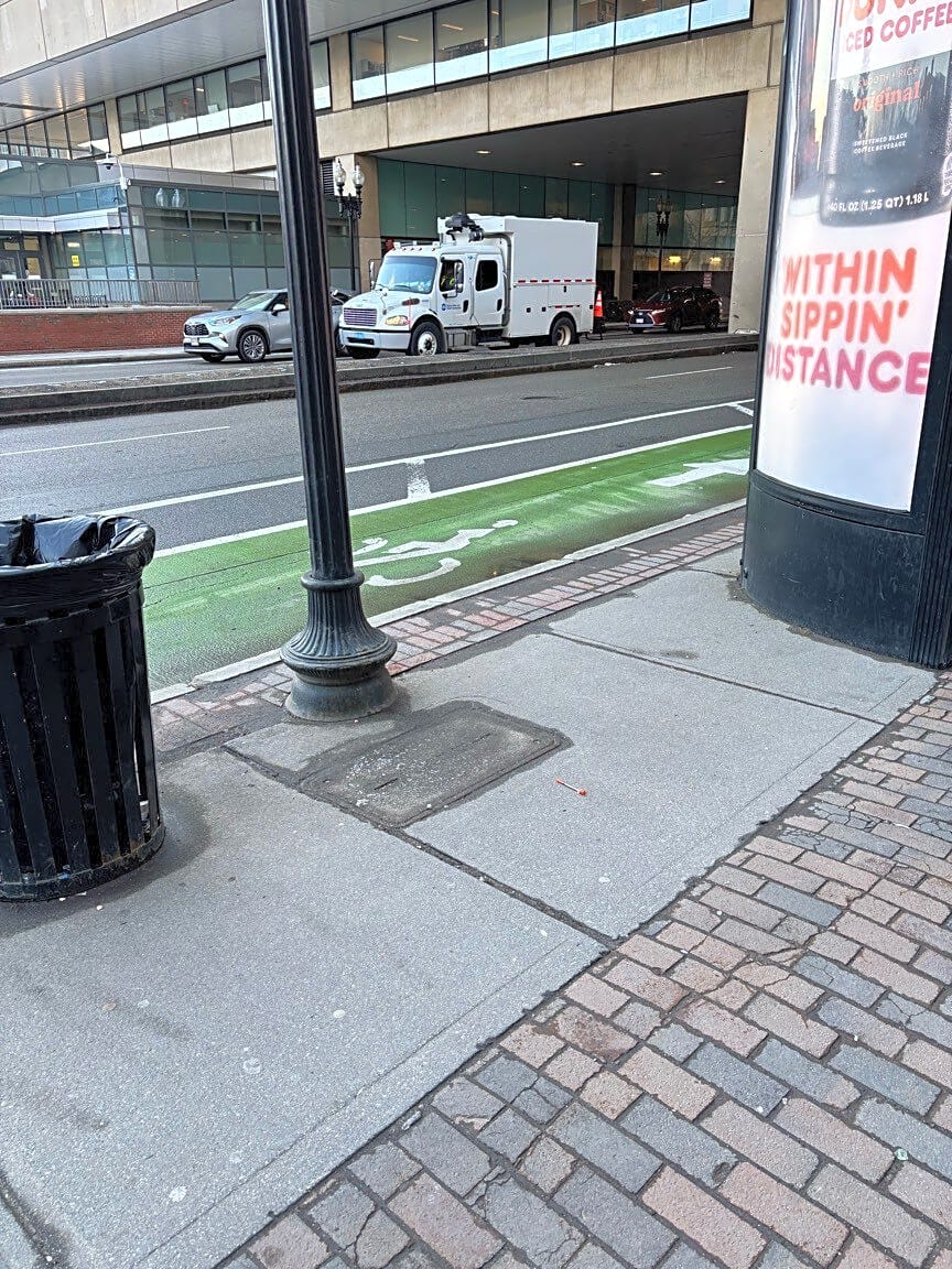 Intersection Of Massachusetts Ave And Harrison Ave, Roxbury, MaNeedle in front of project trust, next to trash can and phone booth.