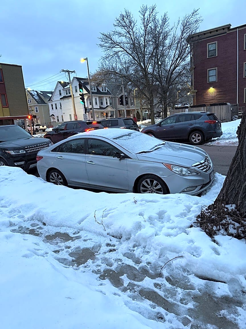 8 Bellevue St, Dorchester, Ma, 02125Vehicle parked on corner of Bellevue street at corner of columbia road in no parking zone in snow making it difficult for vehicles to trip green light resulting in vehicles to run red light