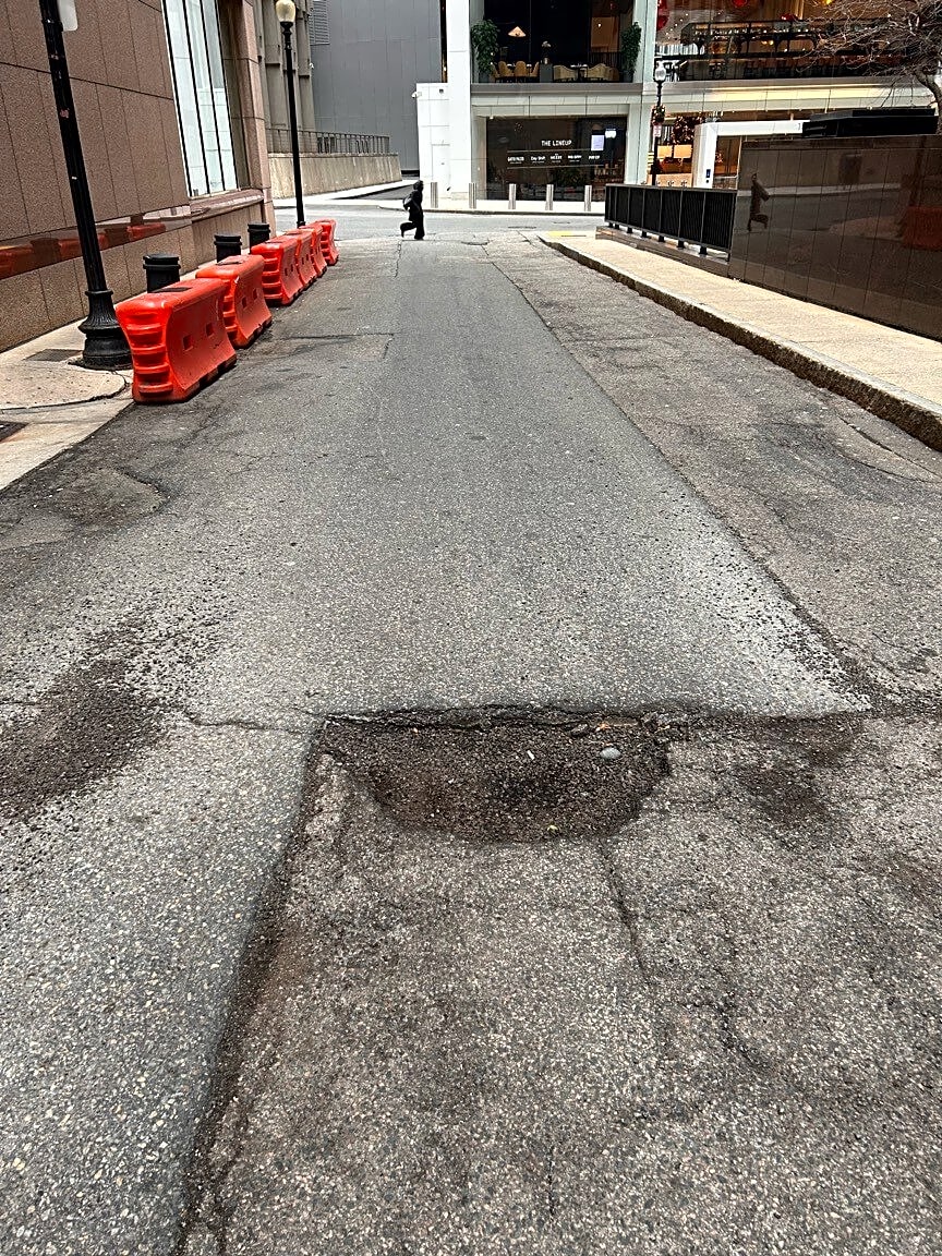150 Federal St, Boston, Ma, 02110Dangerously deep pothole in the middle of the road onto Matthew St.