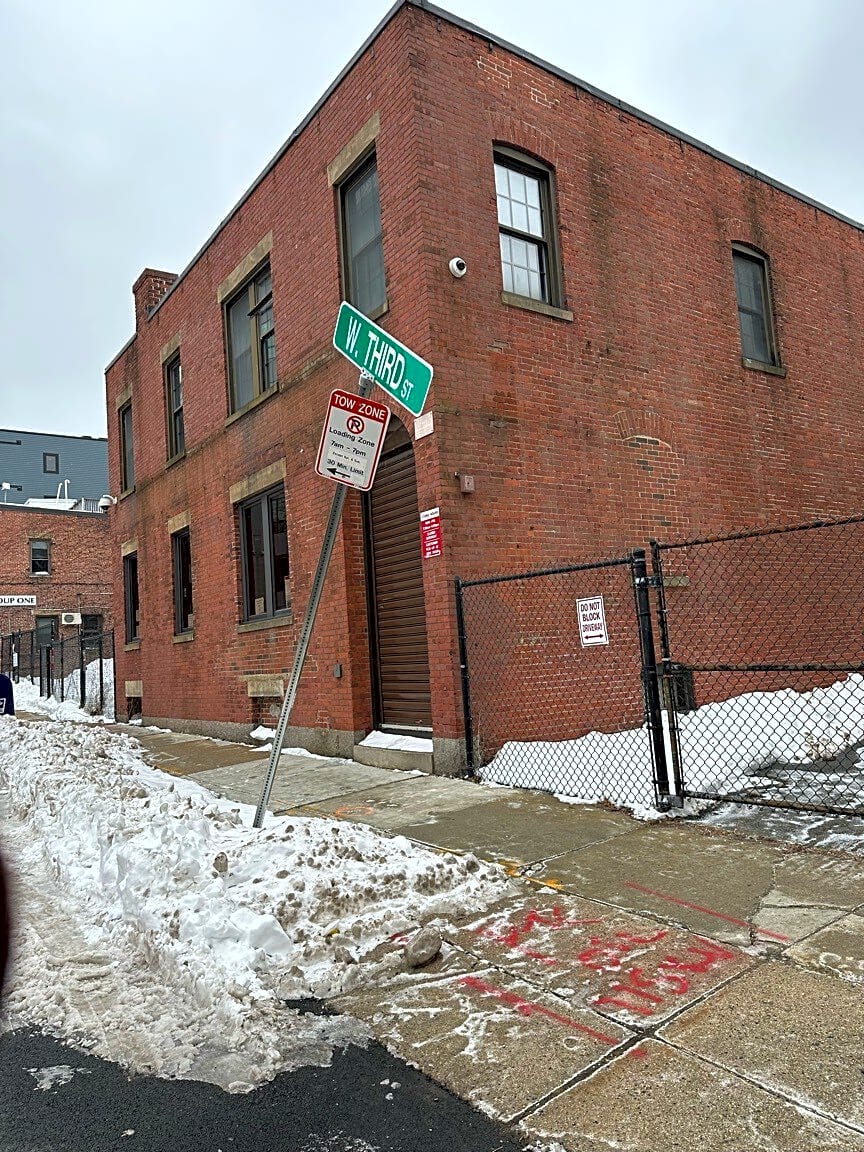 25 W Third St, South Boston, Ma, 02127Bent sign pole leaning towards the sidewalk
