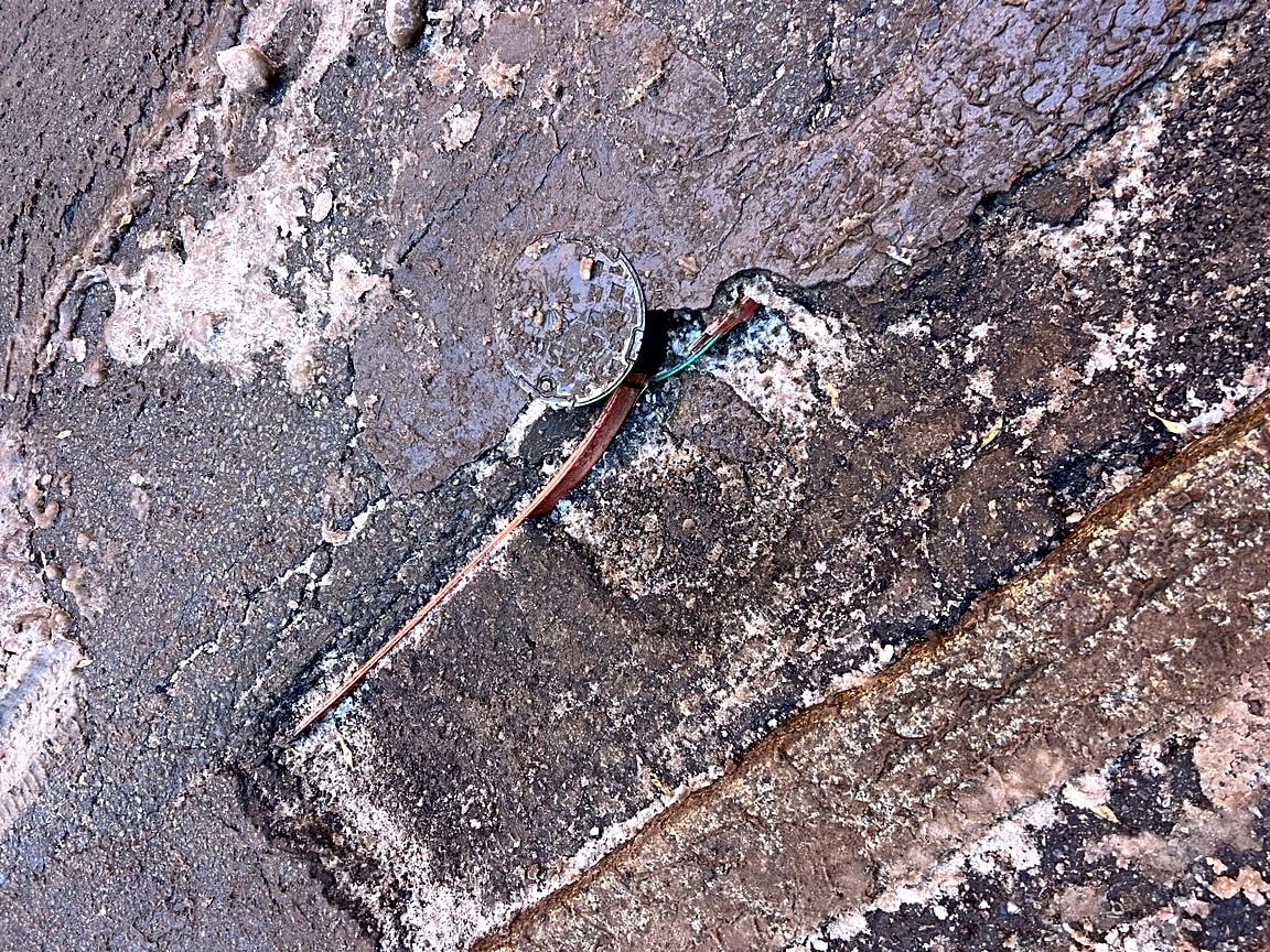 Two large pot holes on public alley 421. One has underground wiring exposed