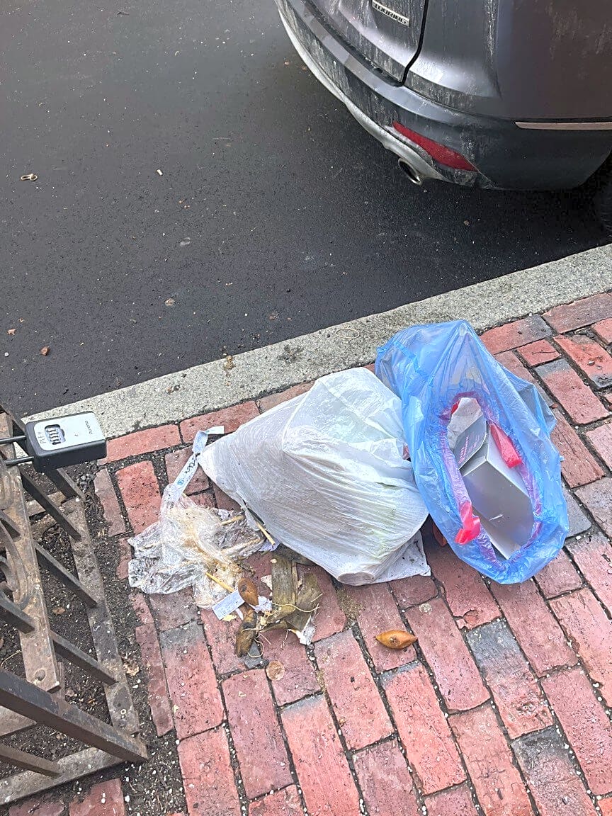 Trash and food strewn all over sidewalk at 85 Phillips. Evidence of rat activity