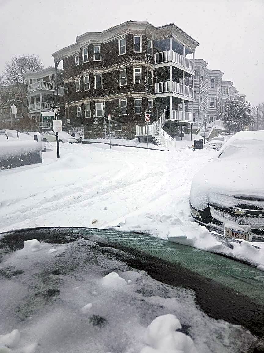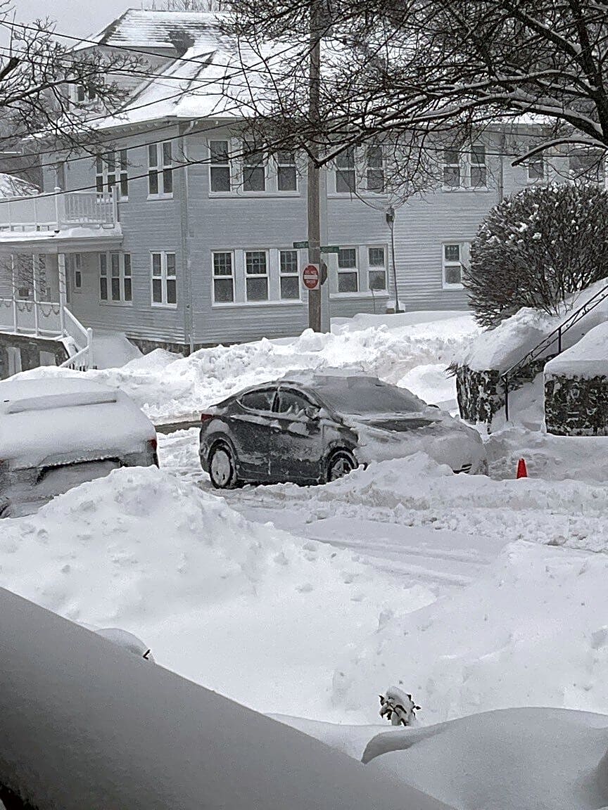 Intersection Of Vershire St And Cowing St, West Roxbury, MaLittle grey Sudan parked on Vershire & Cowing blocking street so plow couldn’t get through. Plow honked a few times, but the owner did not come out to move the car. Other cars cannot get pass through the street either.