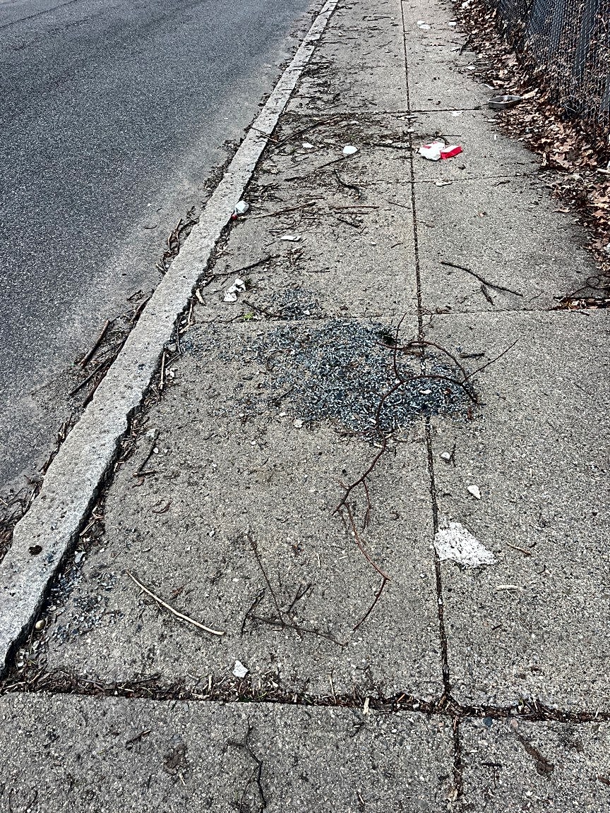 39 Rowe St, Roslindale, Ma, 02131Tons of glass along this stretch of road on the sidewalk.