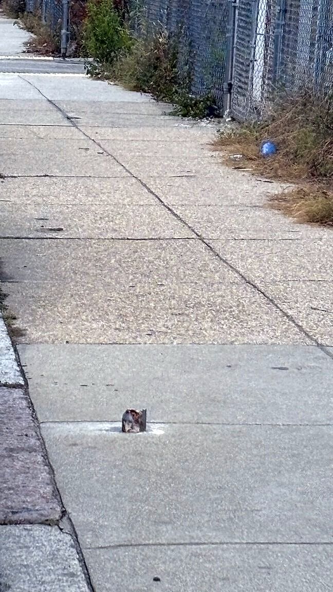 Intersection Of Sumner Sq And Sumner St, Dorchester, MaA street sweeping sign fell over months ago and a sharp, rusty metal stump has been sticking up from the sidewalk ever since. We have and have seen others trip over it. It’s very dangerous. PLEASE remove. Thank you!!