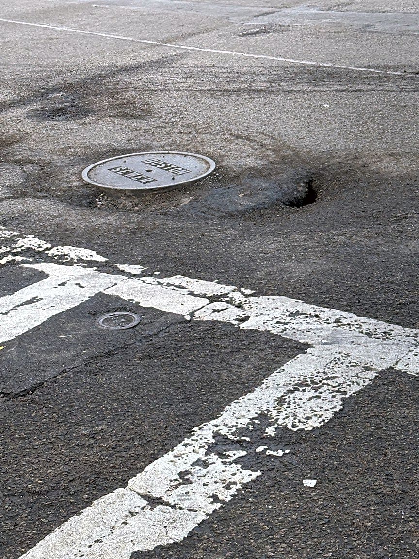 Intersection Of Charles St S And Boylston St And Charles St, Boston, MaMany potholes and hole in a busy intersection. The hole near the manhole is particularly worrying. Intersection is Boylston and Park Plaza near the Starbucks and the old towne trolley tours.