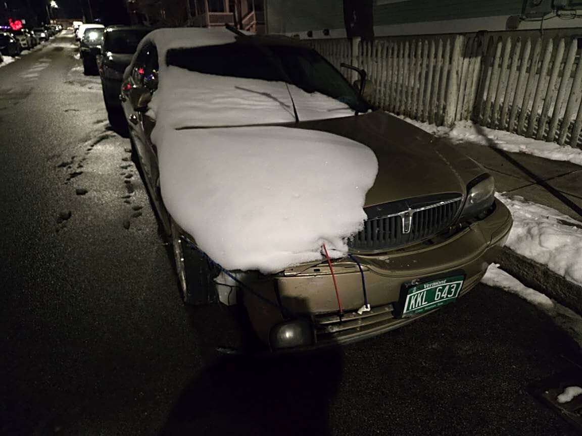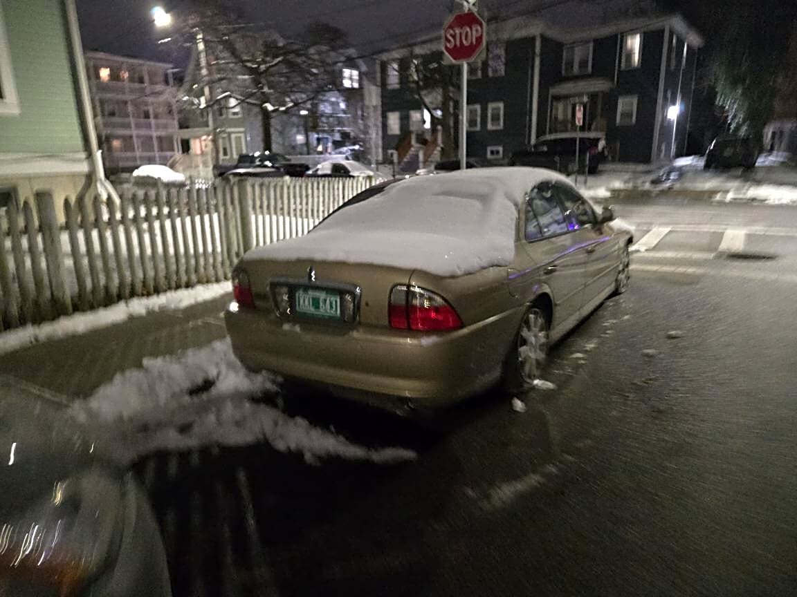 Intersection Of Rosedale St And Whitfield St, Dorchester, MaGOLD LINCOLN with VT plate KKL643. Tires are flat and number is completely detached and held on by bungie chords. Car is completely filled with car parts. Has been here for weeks. Still parked here and is covered in snow.
