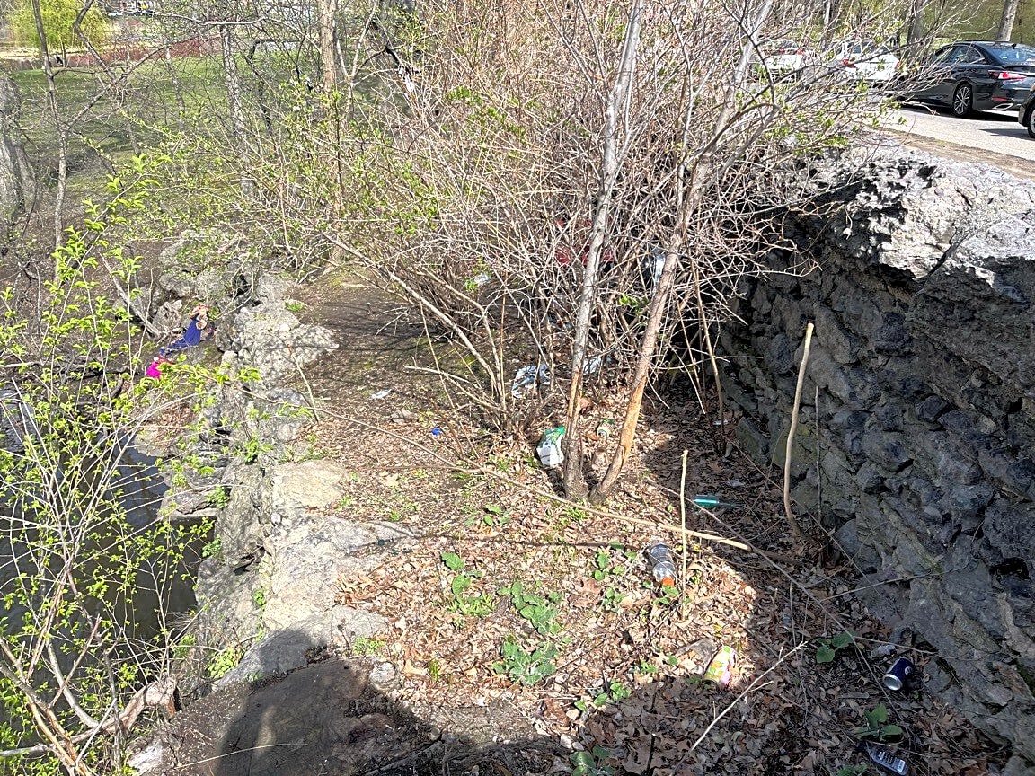 Intersection Of Agassiz Rd And Park Dr, Boston, MaEncampment, drug use, and trash/dis Discarded items behind wall of bridge on Agassiz Rd.
