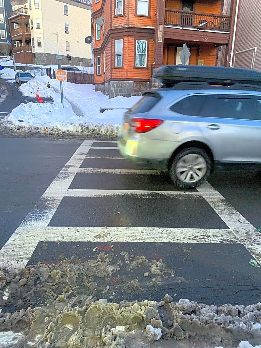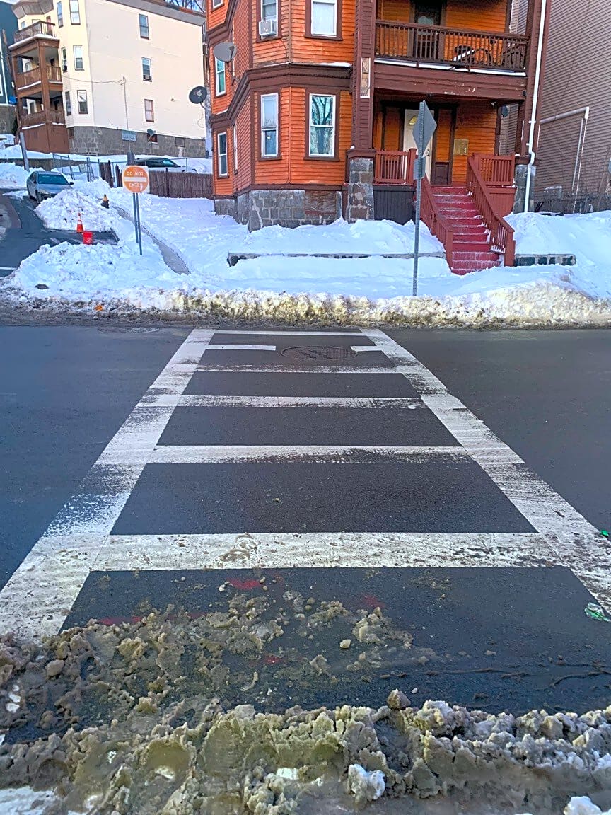 19 Rill St, Dorchester, Ma, 02125Please note that in my neighborhood pedestrian crossings continue to be obstructed with snow. This is dangerous as it forces us to walk on the street. It is already dangerous to use these crossings as cars seldom stop. And now there is snow blocking the sides. Please plough them. See pictures. These are all crossings that I use regularly.