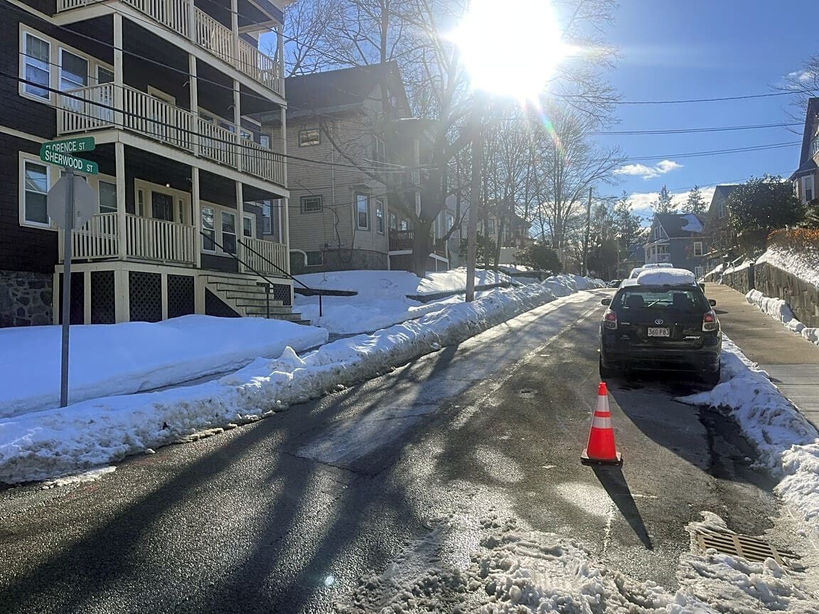 Intersection Of Sherwood St And Florence St, Roslindale, MaTrash in street (cone) Florence and Sherwood, roslindale