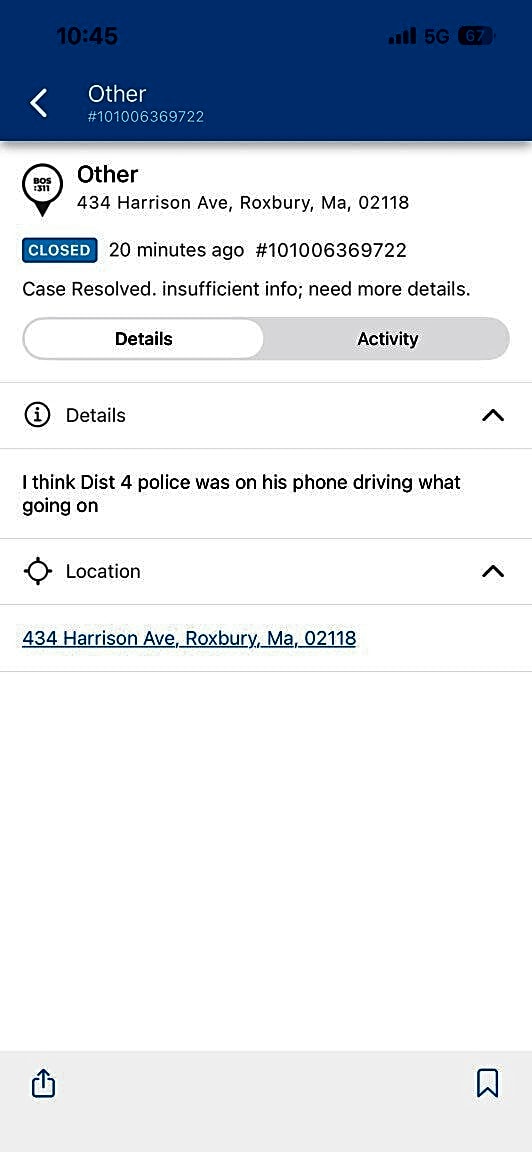 434 Harrison Ave, Roxbury, Ma, 02118Police officers was driving and texting