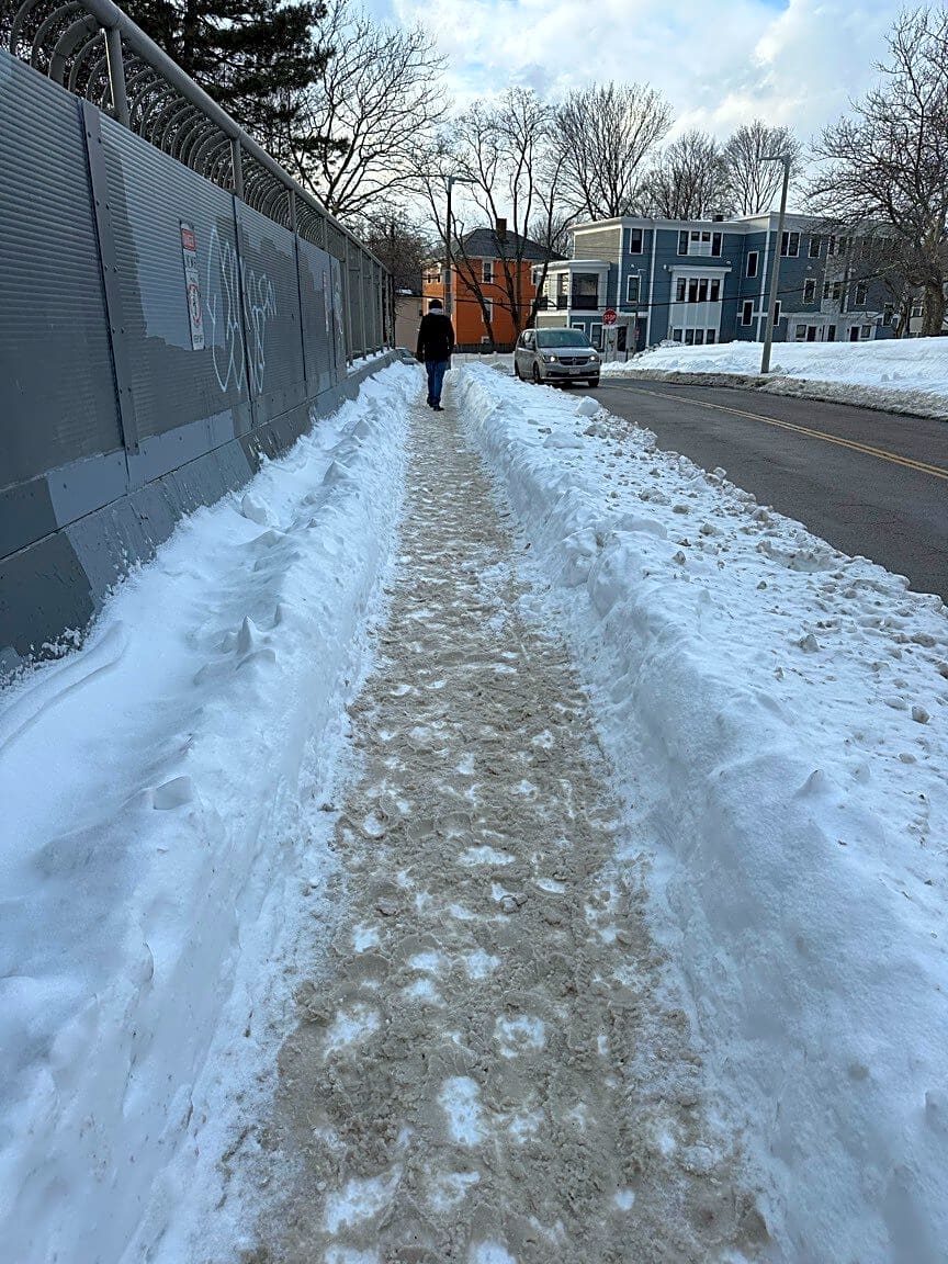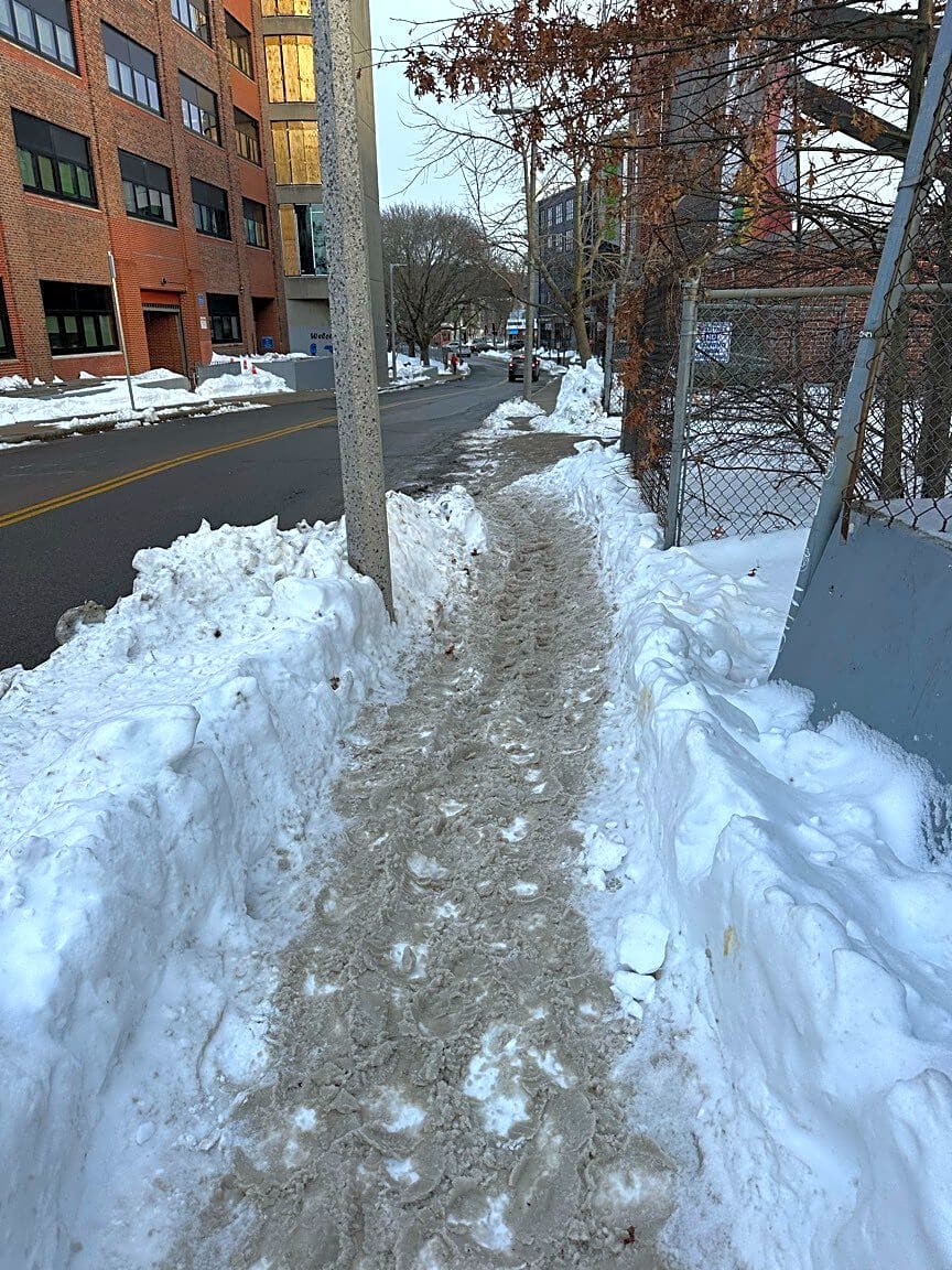 Intersection Of Call St And Mcbride St, Jamaica Plain, MaBridge and sidewalk crossing over orange line on McBride is not shoveled