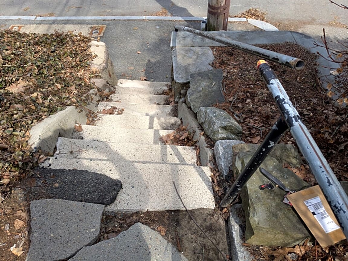 22 May St, Jamaica Plain, Ma, 02130Broken railing, broken pavement on steep incline. Someone almost fell today. Photos attached show the problems. Other photo shows property markers of abutting neighbors. Walkway is located between 12 May Street and 22 May Street