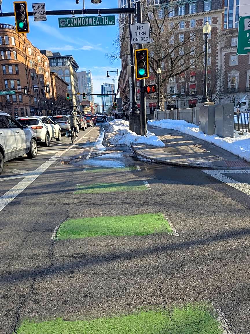 Intersection Of Massachusetts Ave And Boylston St, Boston, MaMultiple snow piles in bike lane at intersection.