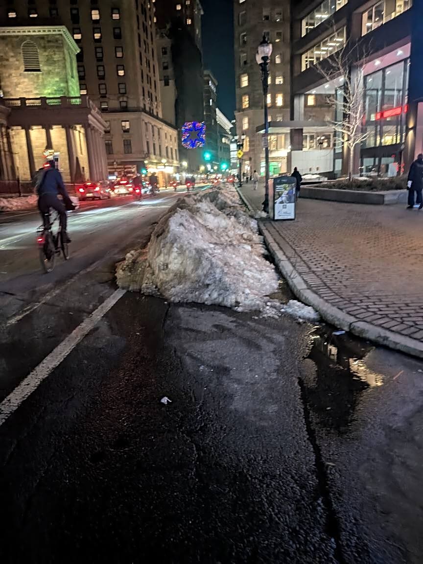 Intersection Of Center Plz And Tremont St, Boston, MaSnow in bike lane.