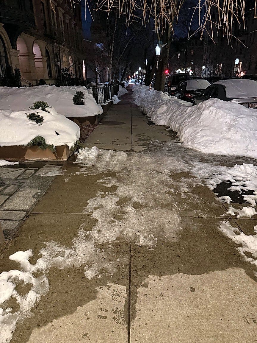 14 Marlborough St, Boston, Ma, 02116Sidewalk in front of 16 Marlborough St not shoveled and has turned into a thick sheet of ice - unsafe for residents who live in the neighborhood