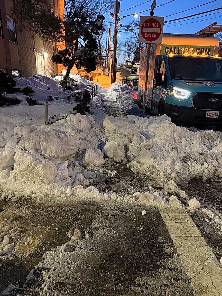 Intersection Of Ledge Hill Rd And Spring St, West Roxbury, MaYou cleared the crosswalk part of the sidewalk, but then blocked the sidewalk in the process. Wtf?