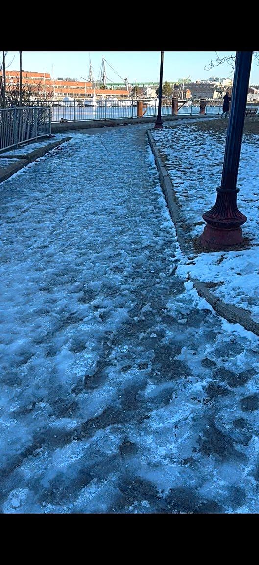 585 Commercial St, Boston, Ma, 02109The areas in between private or city are a dangerous disaster in waiting. How is this ice and snow allowed? Next to a school of children and a busy tourist area. Is this continuously missed or ignored or worse?