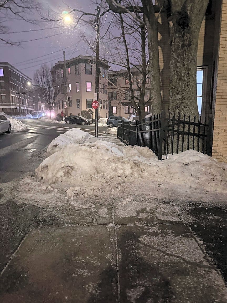 141 Sutherland Rd, Brighton, Ma, 02135Snow bank blocking sidewalk for wheelchair users.