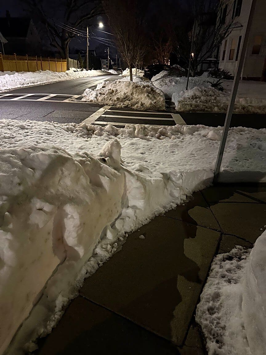 Intersection Of Keith St And Temple St, West Roxbury, MaThree days after storm and crosswalk has not been showered. No access to buildings either for delivery services.