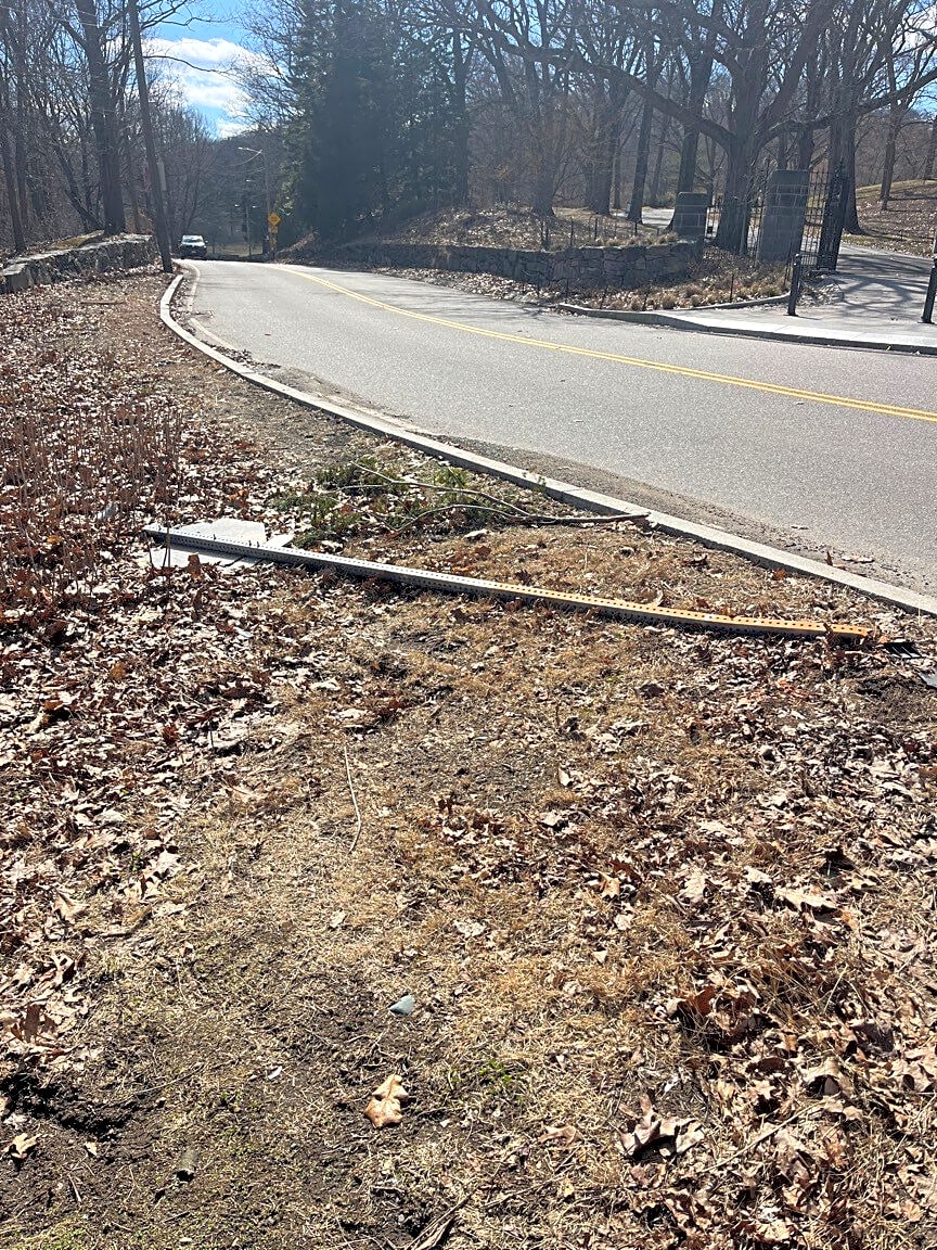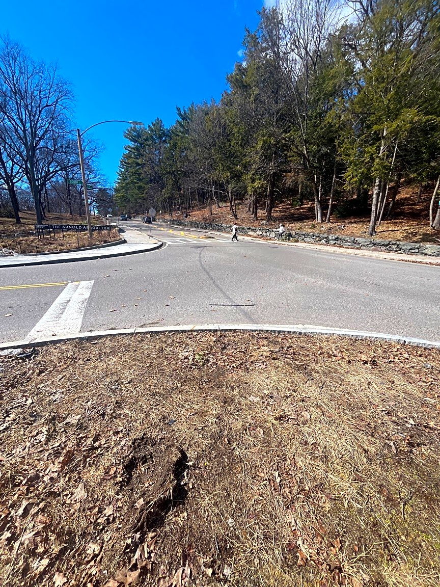 Intersection Of Bussey St And South St, Jamaica Plain, MaStop sign and parking sign down