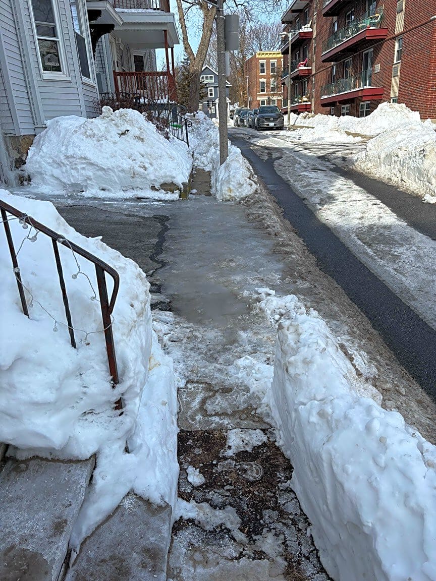 15 Ballard St, Jamaica Plain, Ma, 02130Giant sheet of ice covering sidewalk at end of 15 Ballard St driveway in Jamaica Plain with no visible attempts to clear it since storm