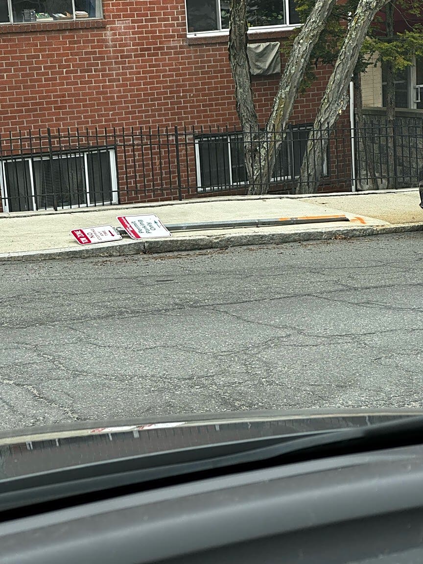 Street sign has fallen down or been knocked down