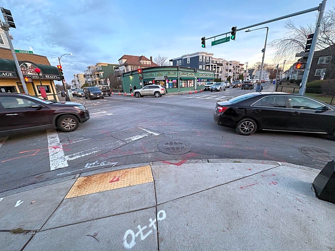 Intersection Of Adams St And Ashmont St, Dorchester, MaSidewalks desperately need painting at the busy intersection of Ashmont/Adams