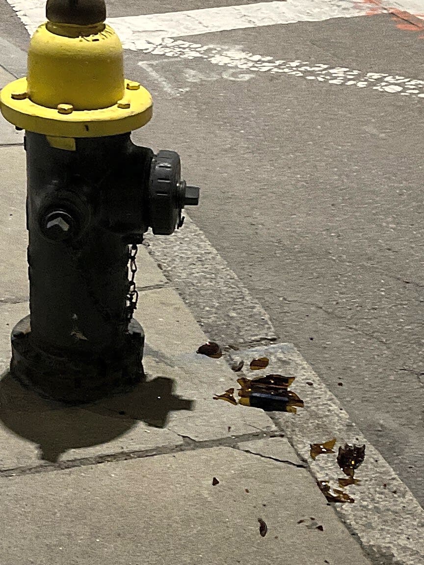Broken beer bottle left near fire hydrant please come pick this up before someone gets hurt