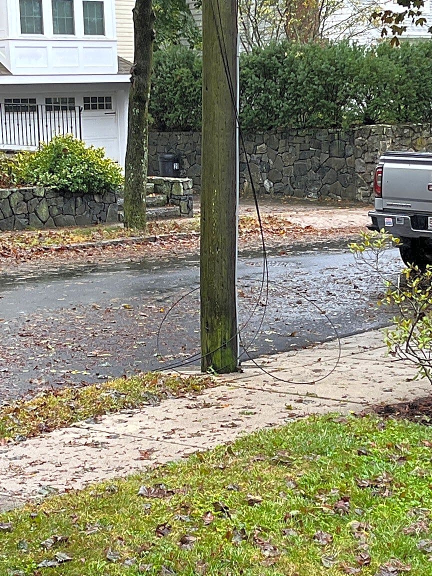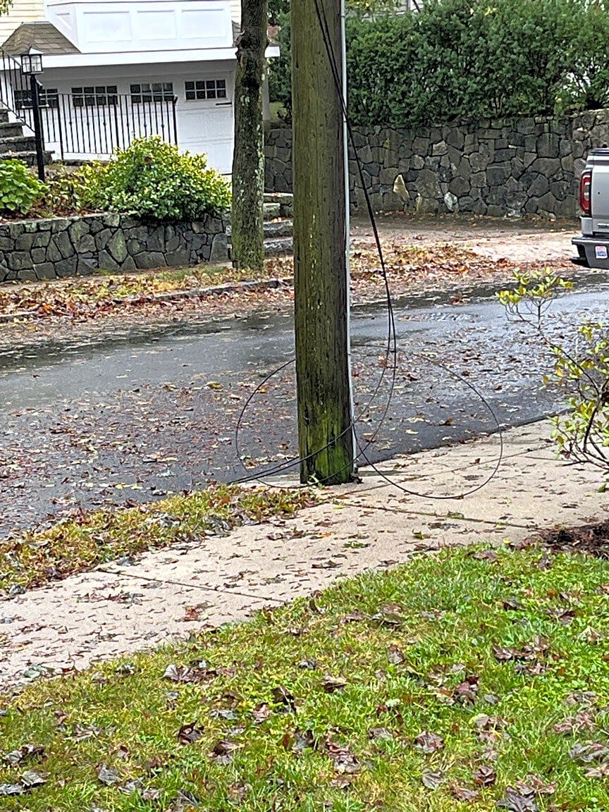 Power line down on sidewalk, Powerline down and laying on the street, safety hazard. Pole is between 15 and 17 Crockers Lane