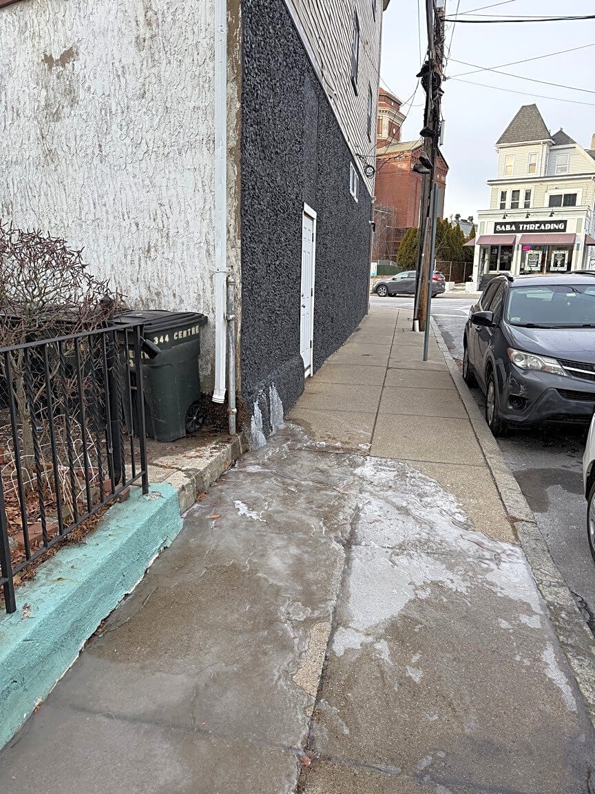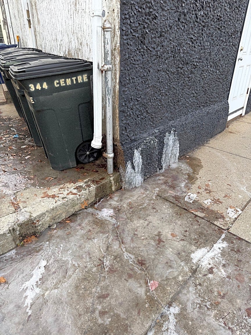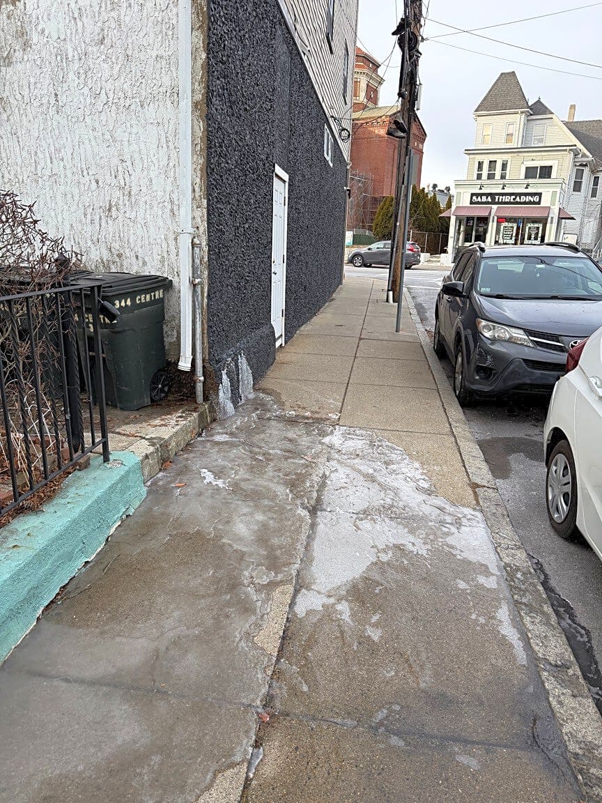342 Centre St, Jamaica Plain, Ma, 02130Downspout is pointing onto the sidewalk and water also seems to be coming out of the foundation. Causes a thick layer of ice to form on the sidewalk.