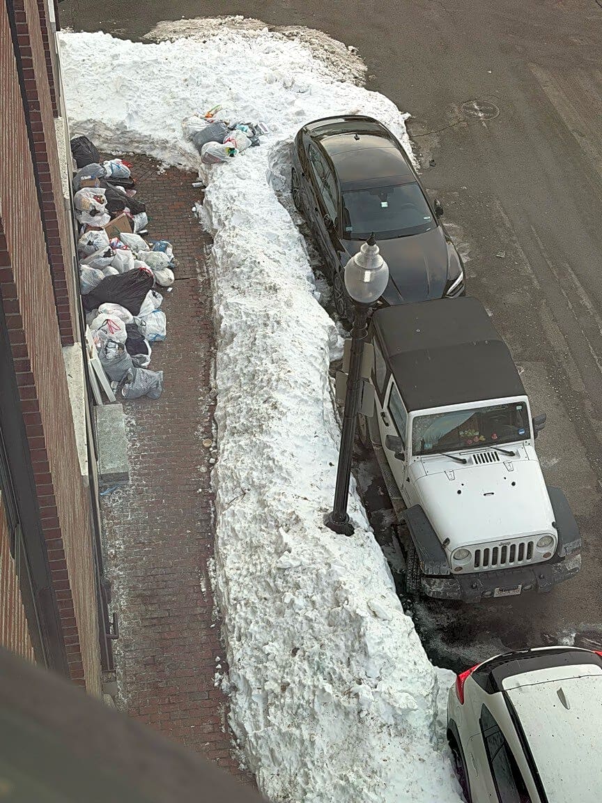 Intersection Of Montgomery St And Union Park, Boston, MaNo trash pick up since the storm. The city plowed a snow bank and trash is behind a snow bank