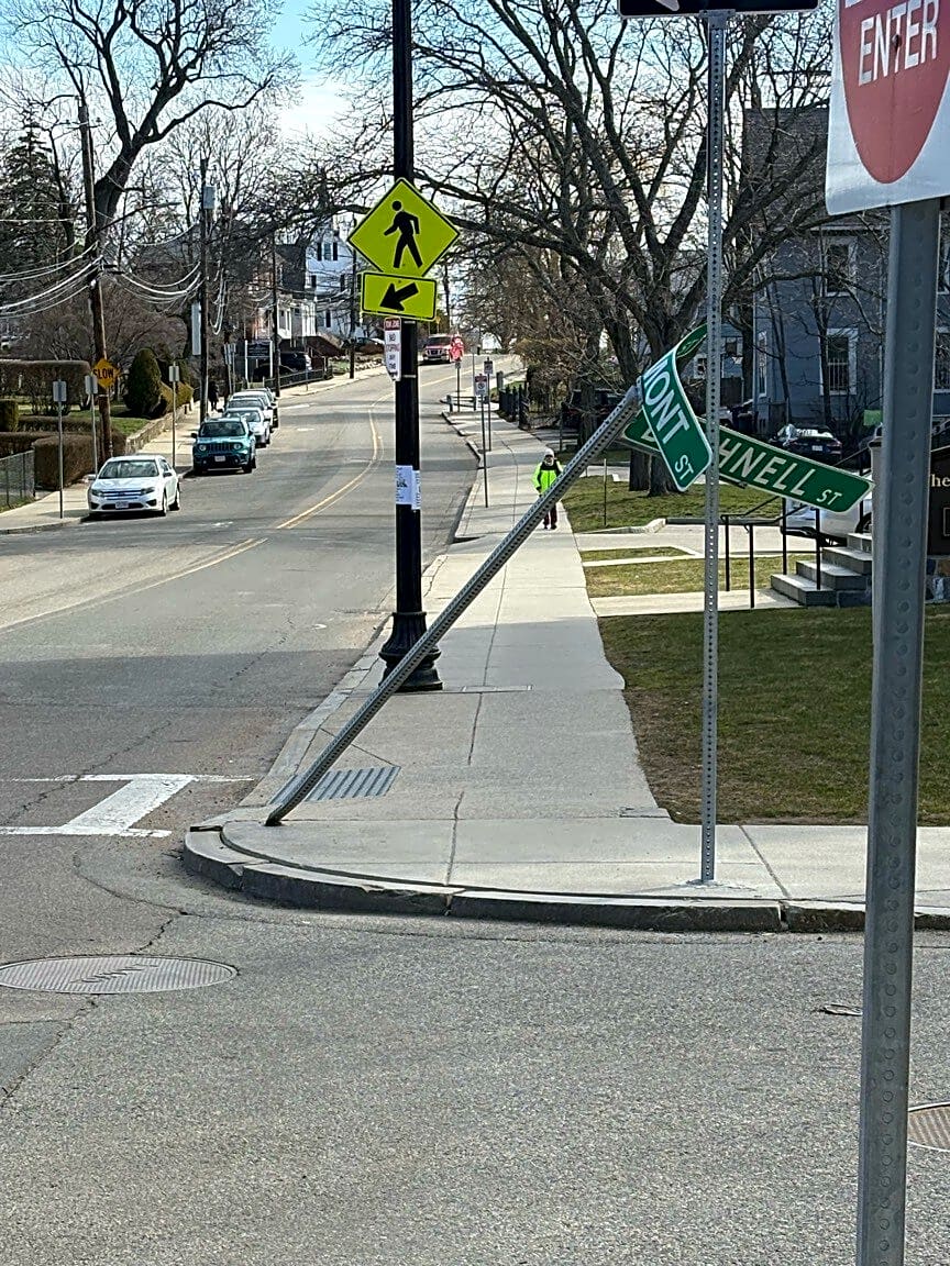 Intersection Of Bushnell St And Ashmont St, Dorchester, MaStreet sign on corner of Ashmont St and Bushnell Rd bent