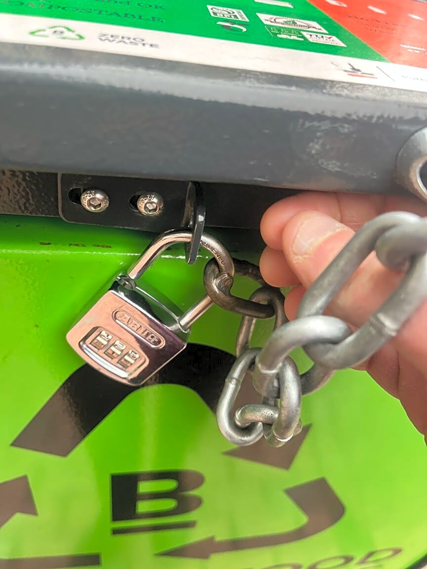 Broken lock on Project Oscar bin at city hall plaza