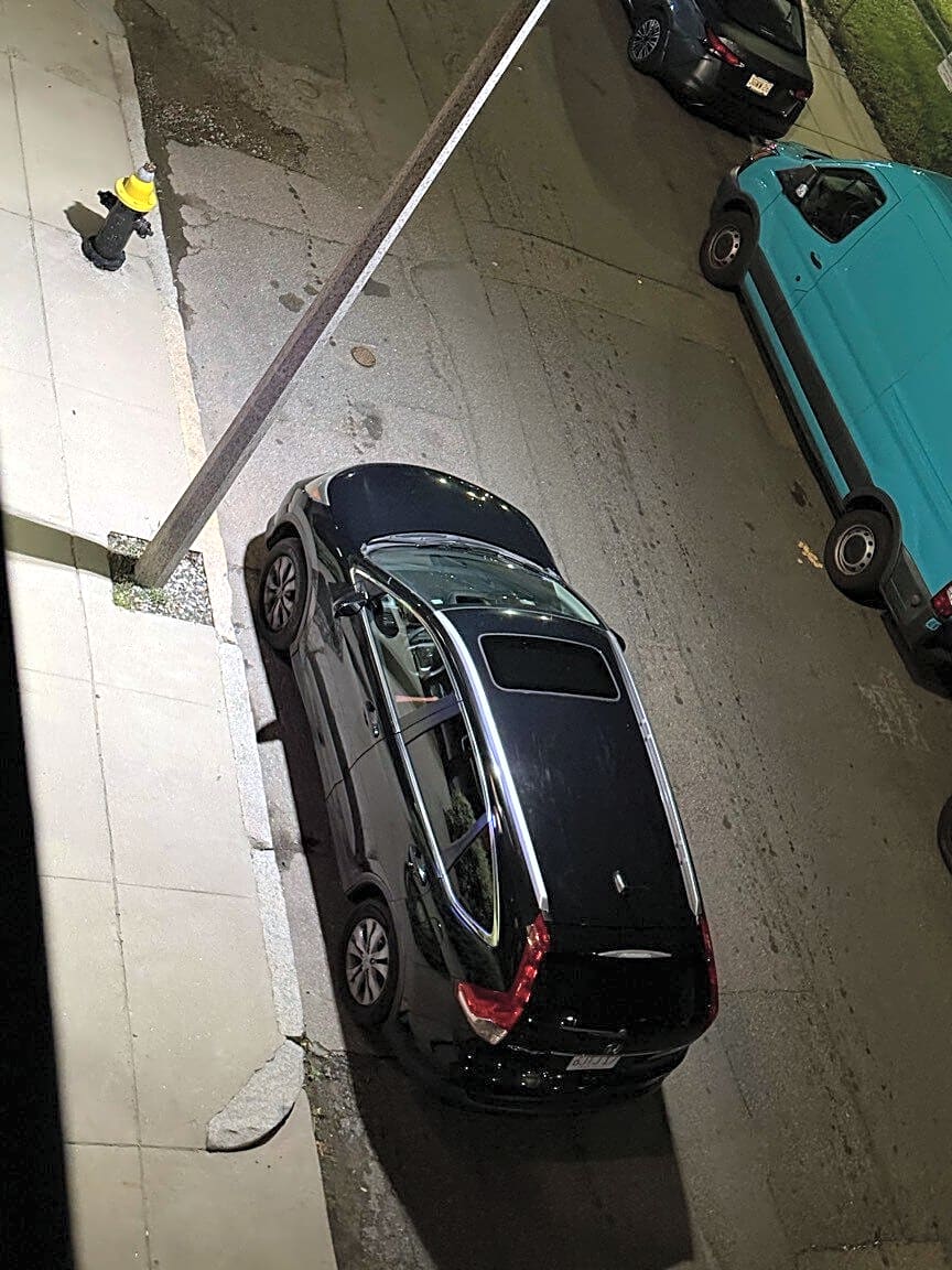 Overnight illegal car parking infront of the fire hydrant at 92 George St, Roxbury, MA 02119. A serious safety matter of life and death to ponder upon!!