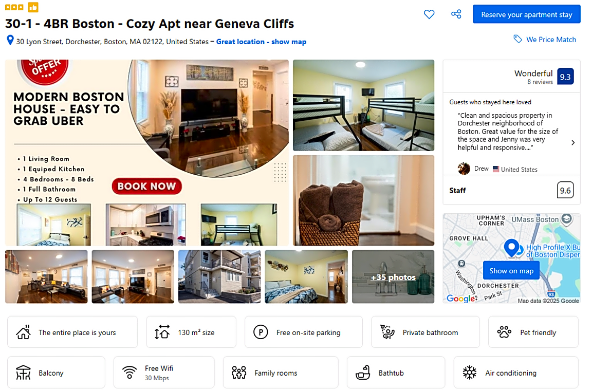 30 Lyon St, Dorchester, Ma, 02122Short term rental violation. 30 Lyon St is a three family building with a single owner (which is an LLC). One unit is offered as a short term rental at https://www.booking.com/hotel/us/30-1-fully-furnished-spacious-1st-floor-apartment-in-boston.html